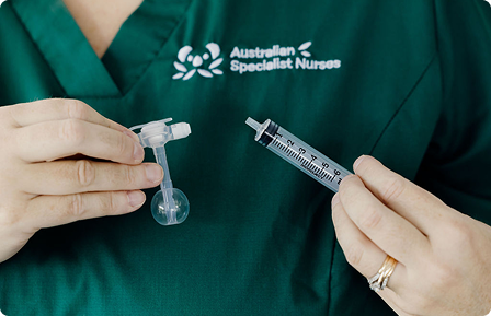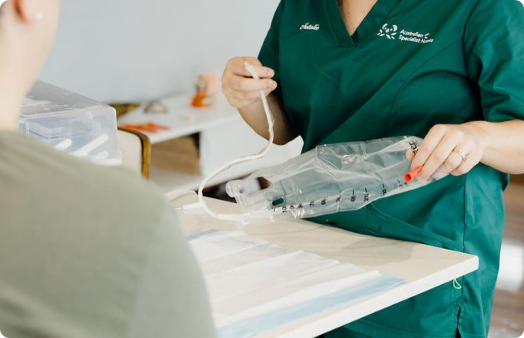 Clinical support including tube changes, stoma measuring, skin management, and education for educators and carers.